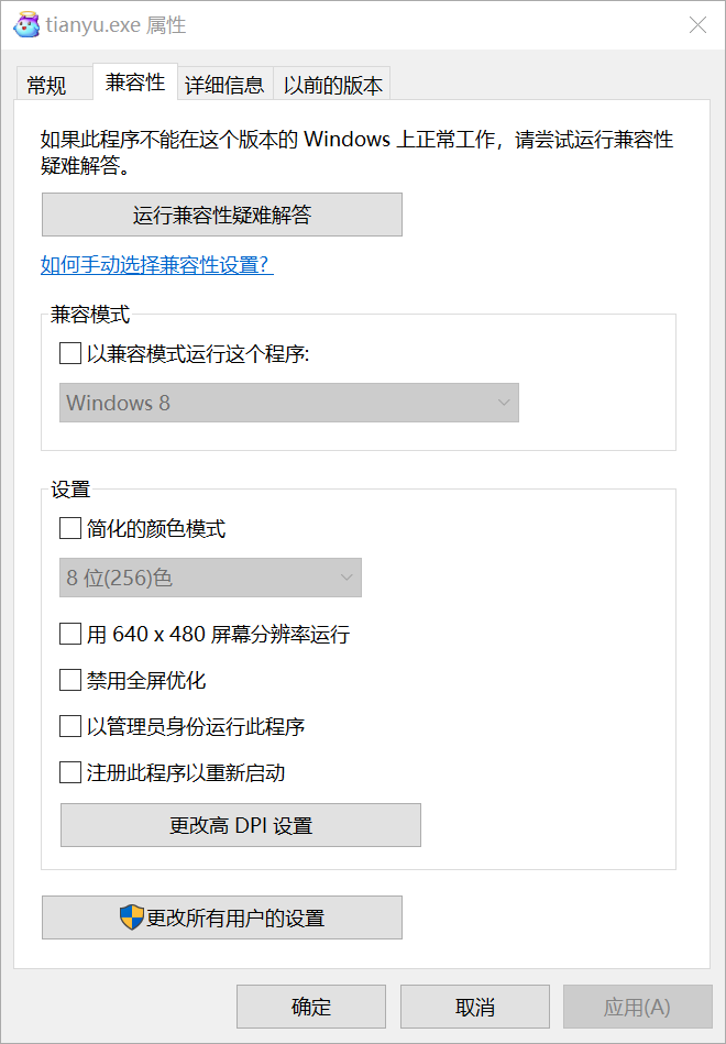 如果上述操作並未生效,請對執行程式 tianyu.exe 使用滑鼠右鍵選單,選擇“屬性”開啟“屬性視窗”,